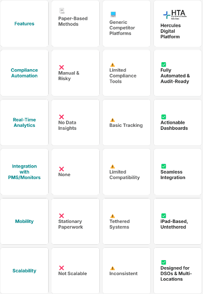 See how Hercules transforms dental anesthesia management compared to paper-based methods and generic platforms
